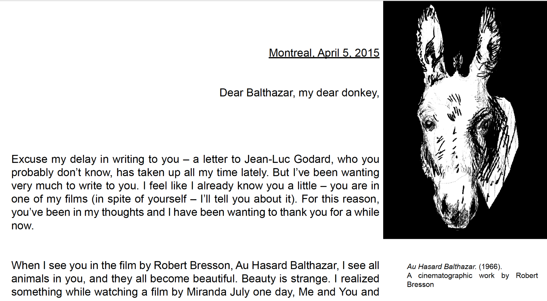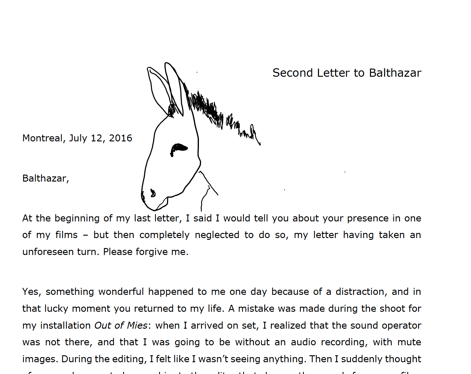 '' In Letter to Balthazar, I chose writing a letter to the donkey Balthazar of Robert Bresson's film Au Hasard Balthazar (1966.) I analyze how desynchronization works through the presence of Balthazar. Writing is like a walking practice for me. The destination is unsure. The fictional conversation brings the reader to the work of film directors Miranda July, John Cassavetes and their warm and fragile characters, the underdogs. ''