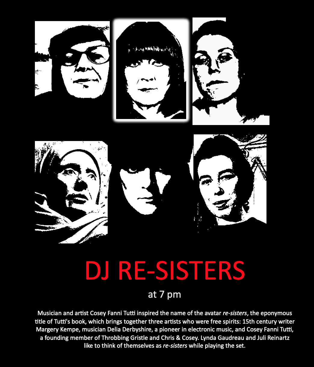 Musician and artist Cosey Fanni Tutti inspired the name of the avatar Re-Sisters, the eponymous title of Tutti's book, which brings together three artists who were free spirits: 15th century writer Margery Kempe, musician Delia Derbyshire, a pioneer in electronic music, and Cosey Fanni Tutti, a founding member of Throbbing Gristle and Chris & Cosey. Lynda Gaudreau and Juli Reinartz like to think of themselves as re-sisters while playing the set.
